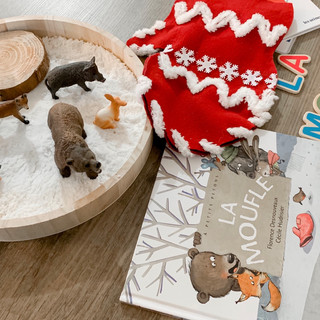 Pour finir nous avons étudié le conte d’origine russe « la moufle » autour d’un jeux libre avec de la neige artificielle DIY :